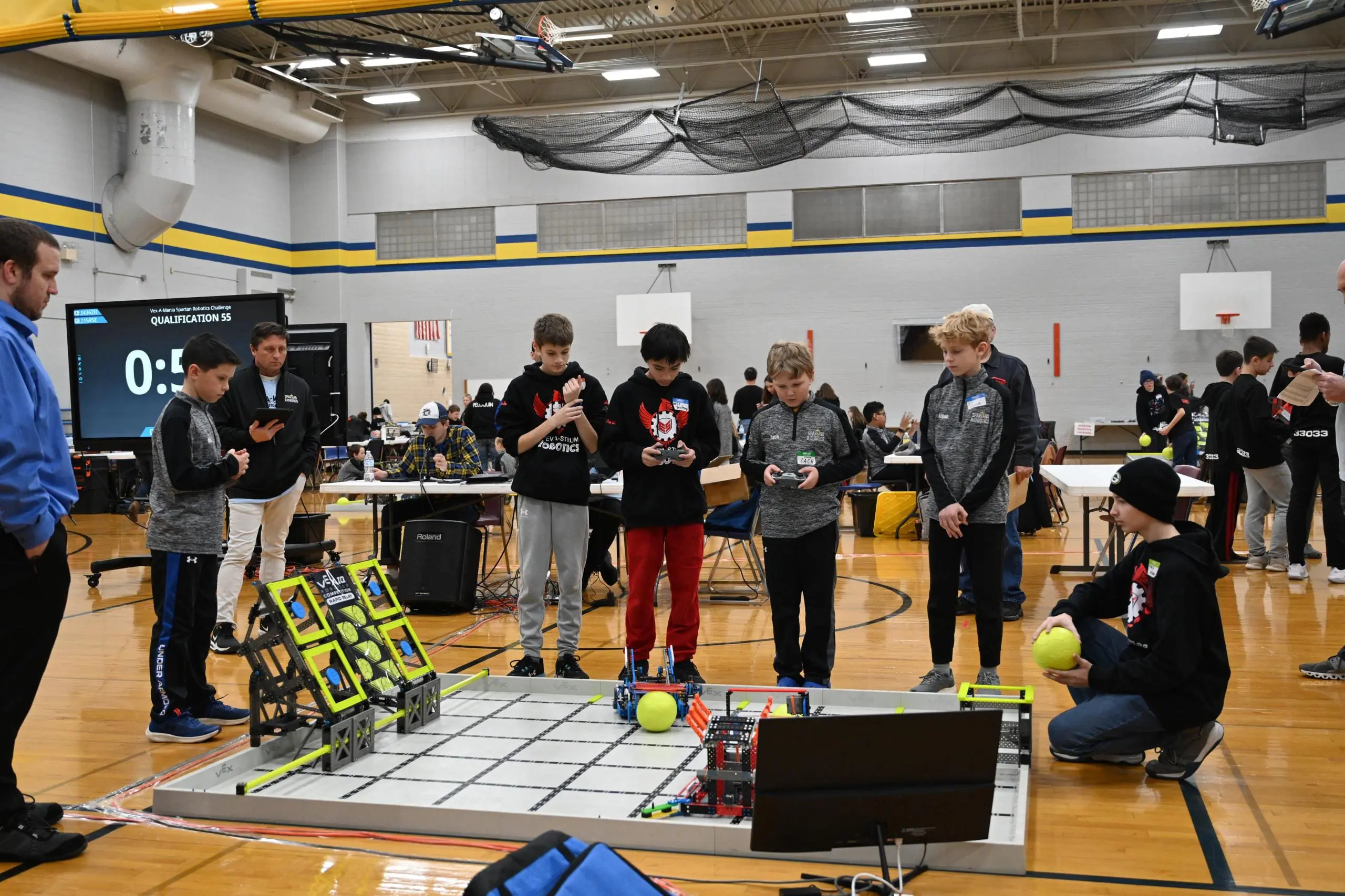 En el torneo V5RC de nivel de escuela secundaria, los equipos participaron en un juego llamado "High Stakes". El juego requiere que los robots recolecten anillos alrededor del campo y los depositen en estacas de varios tamaños mientras intentan escalar una pared de cuatro pies de altura al final del partido. En los torneos VEX VRC, las rondas de clasificación matutinas duran 2 minutos, con los primeros 15 segundos programados de forma autónoma y los últimos 1:45 controlados por un estudiante conductor. Los equipos de robots se clasifican en función de su desempeño matutino para ganar un lugar en un grupo final de eliminación directa que se lleva a cabo por la tarde. Además, todos los equipos tuvieron la oportunidad de obtener una clasificación de puntuación de habilidad en un campo separado al mostrar su programa controlado por el conductor de un minuto y su programa autónomo de un minuto. A lo largo del evento, los equipos de robots fueron entrevistados y juzgados por su proceso de diseño y cuadernos de ingeniería.